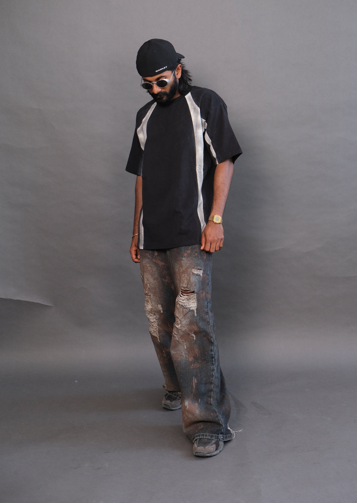 A statement tee defined by its bold contrast paneling, merging sharp lines with a relaxed silhouette. Crafted from soft yet durable fabric, it delivers comfort without compromising edge—an essential piece for contemporary streetwear with a refined attitude.
