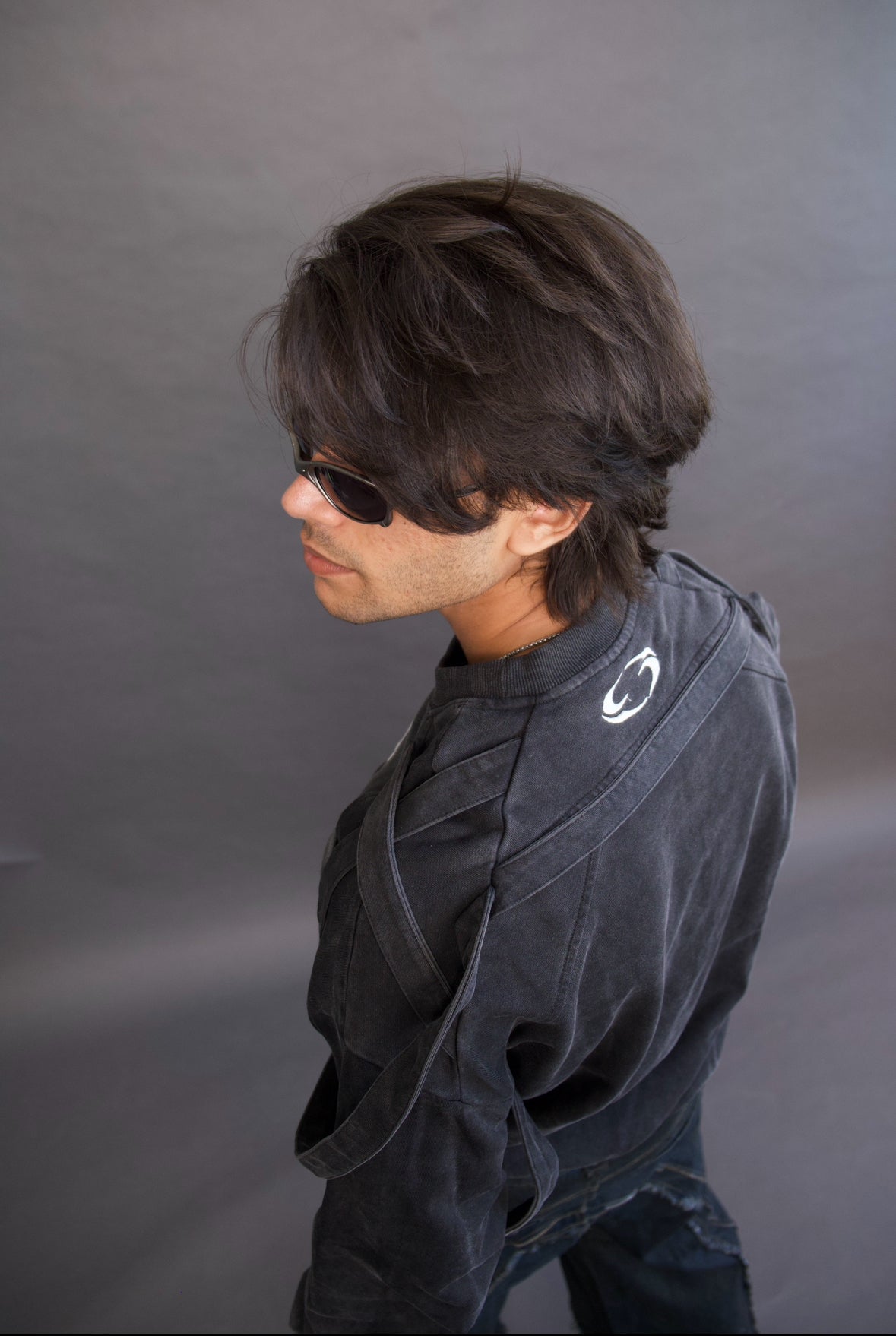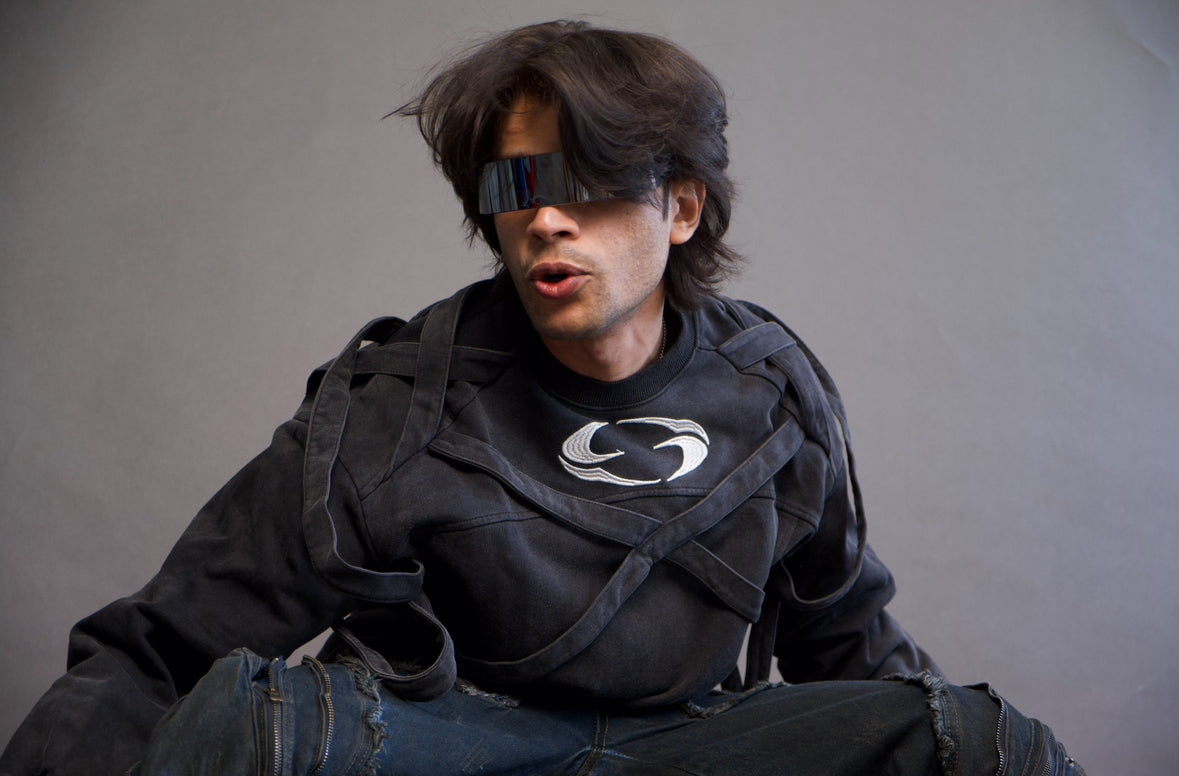 A futuristic, oversized charcoal sweatshirt featuring a bold white graphic emblem on the chest. The shirt has a layered, strappy design across the shoulders and chest, giving it a structured, cyberpunk-inspired look. Made from heavyweight fabric, it pairs well with streetwear or tech wear aesthetics.